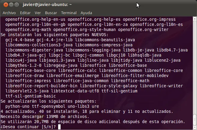 Y se procede a la instalación. Luego de concluida la misma, se puede acceder al programa desde Aplicaciones > Oficina > LibreOffice.