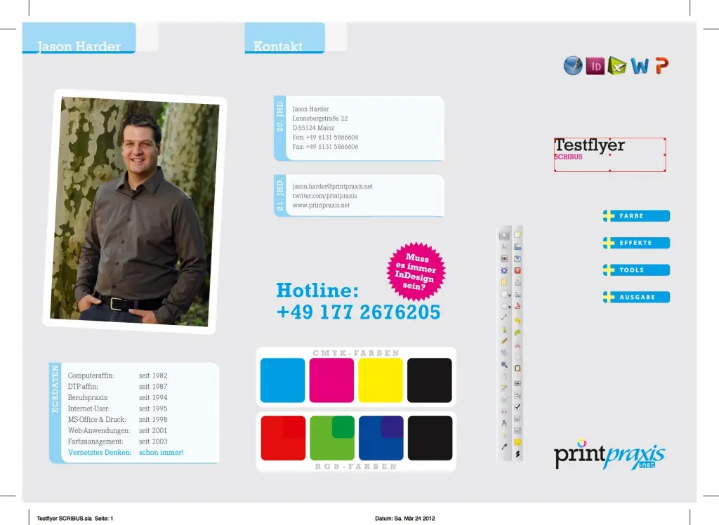 Fue entonces que vi la charla «Scribus in Real-World Scenarios: Pros and Cons» de Christoph Schäfer y Jason Harder. Interesado, principalmente en la segunda parte de la charla, busqué y di con el sitio de Jason Harder: printpraxis.net.