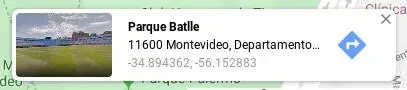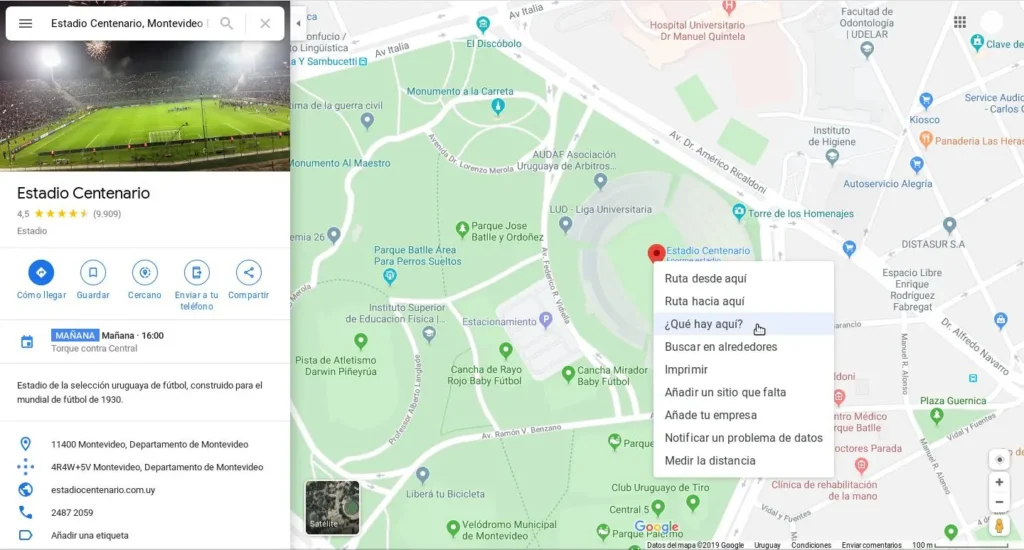 - Buscar el lugar en cuestión en un Mapa de Google. Supongamos que se quiere saber las coordenadas de la ubicación del Estadio Centenario de Montevideo: