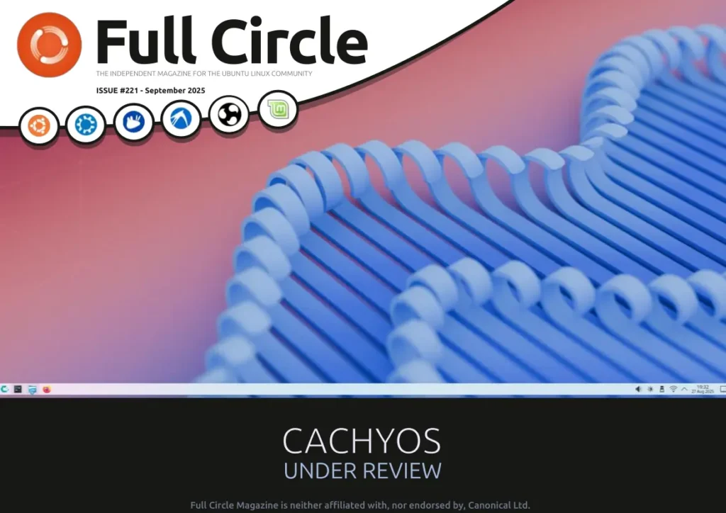 Desde hace días está disponible para descargar la edición #222 de Full Circle magazine y en breve saldrá la #223, pero yo todavía tenía pendiente de hacer mi reseña de la edición #221, así que en esta entrada pago mi deuda. Se trata del número correspondiente a setiembre de 2025 y se publicó el 26 de ese mes. Consiste en un PDF de 62 páginas y de 2,9 MB.